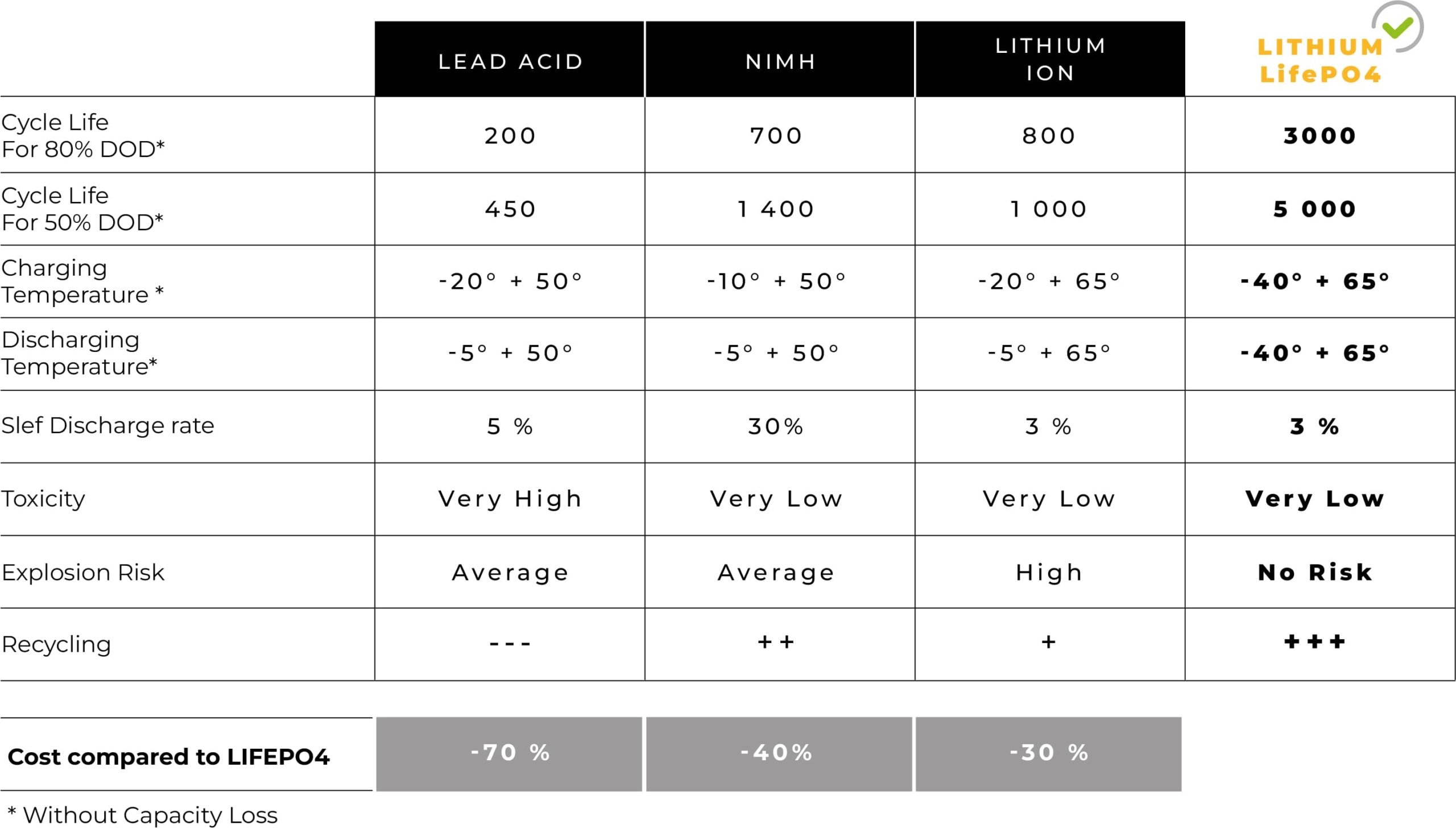 COMPARATIVE TABLE OF THE DIFFERENT BATTERY TECHNOLOGIES